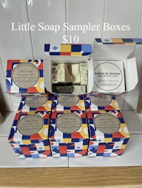 Includes seven different soaps, 1/4 bar each. In a cute, colourful box.